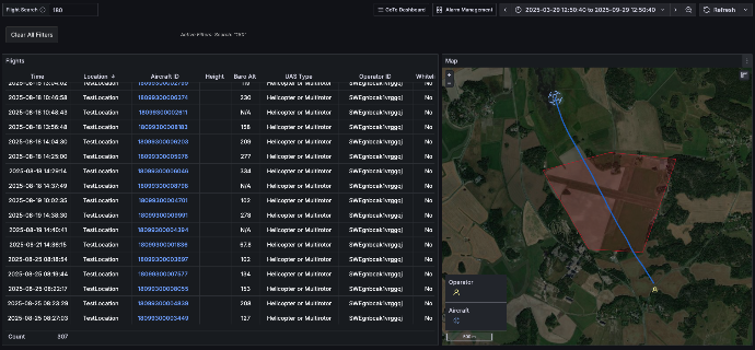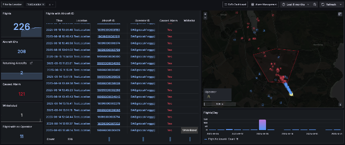 With dFuse and for example dAware, our low-cost entry-level drone detection hardware, based on Direct Remote ID, operators gain access to detailed statistics that support faster decision-making and long-term planning. Data from drones, radar, and other sensors is automatically logged and visualized, making it possible to:
